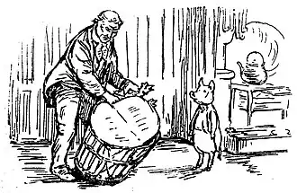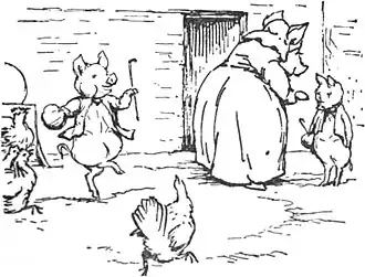 Before Pigling could reply, a neighbor, who was giving Mr. Piperson and the hens a lift, whistled from the gate. Mr. Piperson hurried out with the hamper, enjoining Pigling to shut the door behind him and not meddle with nought; or "I'll come back and skin ye!" said Mr. Piperson.