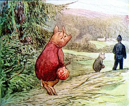 "What's that, young Sirs? Stole a pig? Where are your licences?" said the policeman. They had nearly run against him round a corner. Pigling Bland pulled out his paper; Alexander, after fumbling, handed over something scrumply—