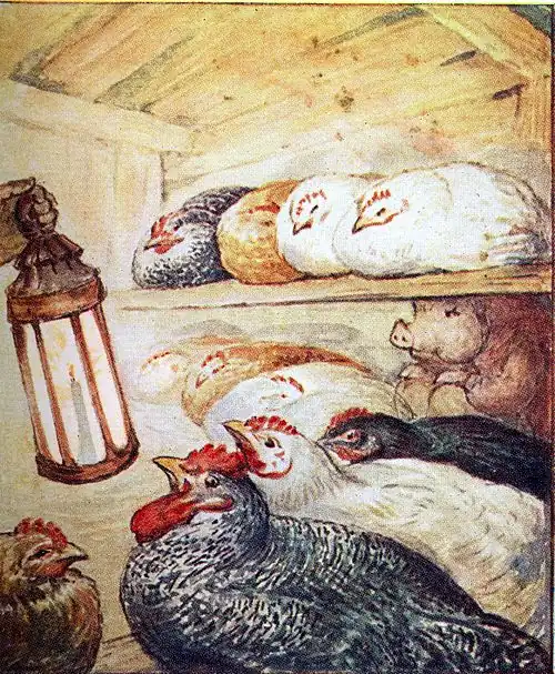 "Trap, trap, trap! cackle, cackle, cackle!" scolded the disturbed cockerel. "To market, to market! jiggetty jig!" clucked a broody white hen roosting next to him. Pigling Bland, much alarmed, determined to leave at daybreak. In the meantime, he and the hens fell asleep.