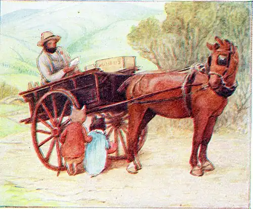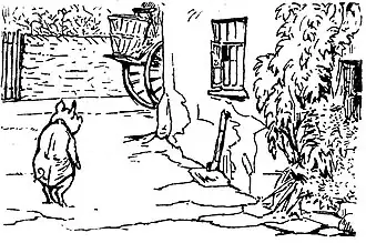 The grocer, intent upon his newspaper, might have passed them if his horse had not shied and snorted. He pulled the cart crossways and held down his whip. "Hallo? Where are you going to?"—Pigling Bland stared at him vacantly.