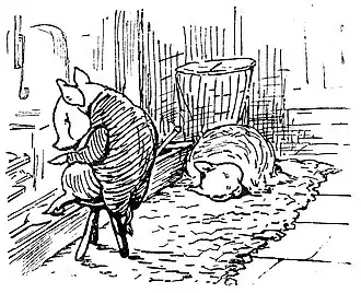 After finishing breakfast at his leisure, Pigling had a look round the cottage; everything was locked up. He found some potato peelings in a bucket in the back kitchen. Pigling ate the peel, and washed up the porridge plates in the bucket. He sang while he worked—