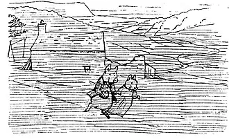 Never did pigs run as these pigs ran! They raced and squealed and pelted down the long white hill towards the bridge. Little fat Pig-wig's petticoats fluttered, and her feet went pitter, patter, pitter, as she bounded and jumped.