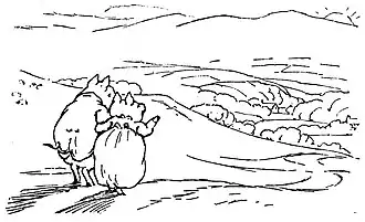 Pig-wig ate the peppermint herself and followed the opposite side of the road. "Pig-wig! keep under the wall, there's a man ploughing." Pig-wig crossed over; they hurried down hill towards the county boundary.