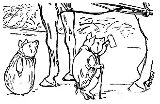 Pigling Bland and Alexander sat down and untied their bundles. Alexander gobbled up his dinner in no time; he had already eaten all his own peppermints—"Give me one of yours, please, Pigling?" "But I wish to preserve them for emergencies," said Pigling Bland doubtfully. Alexander went into squeals of laughter. Then he pricked Pigling with the pin that had fastened his pig paper; and when Pigling slapped him he dropped the pin, and tried to take Pigling's pin, and the papers got mixed up. Pigling Bland reproved Alexander.
