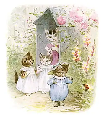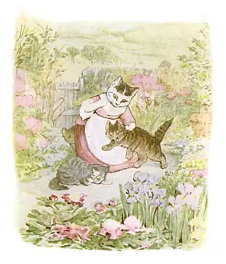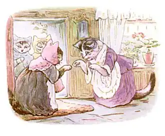 BUT one day their mother–Mrs. Tabitha Twitchit–expected friends to tea; so she fetched the kittens indoors, to wash and dress them, before the fine company arrived.