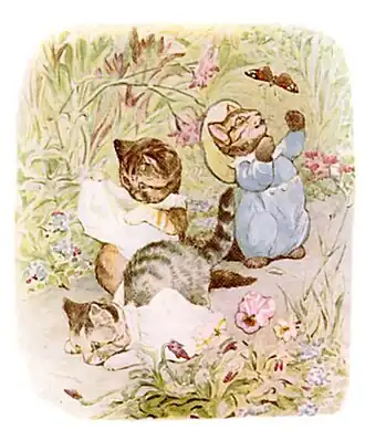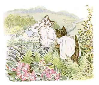 THEN Tabitha Twitchit came down the garden and found her kittens on the wall with no clothes on.