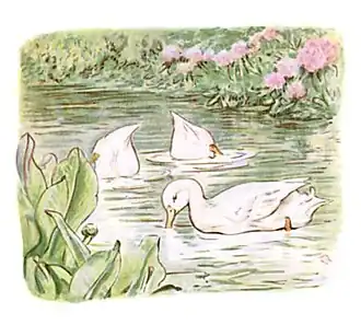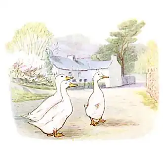 THEN the two duck-birds, Rebeccah and Jemima Puddle-Duck, picked up the hat and tucker and put them on.