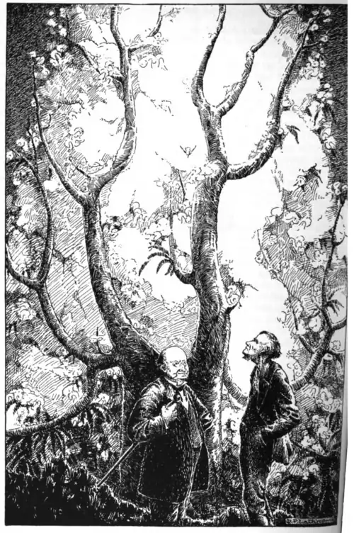 He had stared broodingly about him. The garden was a waste, the hedges untrimmed, a rank lusty growth of weeds flaunted their flowers at the sun. And this tree—it must have been flourishing here for centuries past, a positive eyesore to any practical gardener. P. P. couldn't even put a name to it. Yet by the fixed idiotic dreamy look on his face you might have supposed it was a gift from heaven; that, having waved his hands about like those coloured humbugs with the mango, the thing had sprung up of the ground by sheer magic.