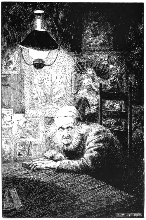 Nevertheless its possessor, this old man, shrunken and hideous in his frame of abject poverty, his arms drawn close up to his fallen body, worked sedulously on and on. And behind and around him showed the fruit of his labors. Pinned to the scaling walls, propped on the ramshackle shelf above his fireless hearthstone, and even against the stale remnant of a loaf of bread on the cracked blue dish beside him, was a litter of pictures. And everywhere, lovely and marvelous in all its guises, the tree—the tree in spring's delight, in autumn's garish decline, in naked, slumbering wintry grace. The colors glowed from the old fine, rough paper like lamps and gems.