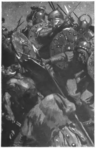 Our triple line bent in like a bow and began to break. The scales of war hung on the turn, when, from the dense belt of trees upon our left, suddenly rose the cry of "Valhalla! Valhalla! Victory or Valhalla!" for which I, who had overheard Jodd's orders, was waiting. These were his orders—that half of the Northmen should creep down behind the belt of trees in their dense shadow, and thus outflank the foe.