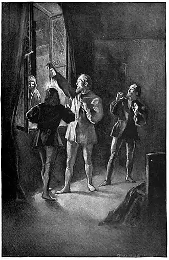 It was late ere Alleyne Edricson, having carried Sir Nigel the goblet of spiced wine which it was his custom to drink after the curling of his hair, was able at last to seek his chamber. It was a stone-flagged room upon the second floor, with a bed in a recess for him, and two smaller pallets on the other side, on which Aylward and Hordle John were already snoring. Alleyne had knelt down to his evening orisons, when there came a tap at his door, and Ford entered with a small lamp in his hand. His face was deadly pale, and his hand shook until the shadows flickered up and down the wall.
