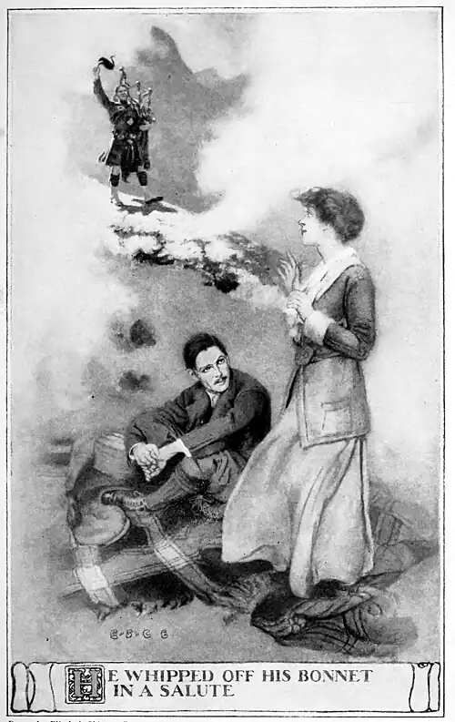 The mist was clearing, and floated about like a thin veil through which one could see objects. At a short distance above us on the moor I saw something moving. It was a man who was playing the pipes. It was the piper, and almost at once I knew him, because it was actually my own Feargus, stepping proudly through the heather with his step like a stag on the hills. His head was held high, and his face had a sort of elated delight in it as if he were enjoying himself and the morning and the music in a new way. I was so surprised that I rose to my feet and called to him.