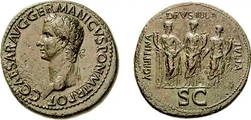 This should be Caligula himself, because the legend reads C CAESAR AVG GERMANICVS PON M TR POT (Germanicus never held the tribunicia potestas) and Germanicus was used as his praenomen (Gaius was that of Caligula). |