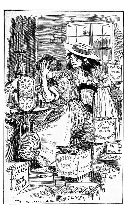 She was a middle-aged woman, and her dark hair, streaked with grey, was screwed up behind in a tight knob. Her sleeves were tucked up, and all round her were piles of those square boxes with wooden divisions in which lemonade and ginger-beer travel about. The boxes were dotted with greeny bottles, some full, some empty, and the boxes were everywhere—on the sink, under the sink, on the copper, on the bricks, and outside the open back door.
