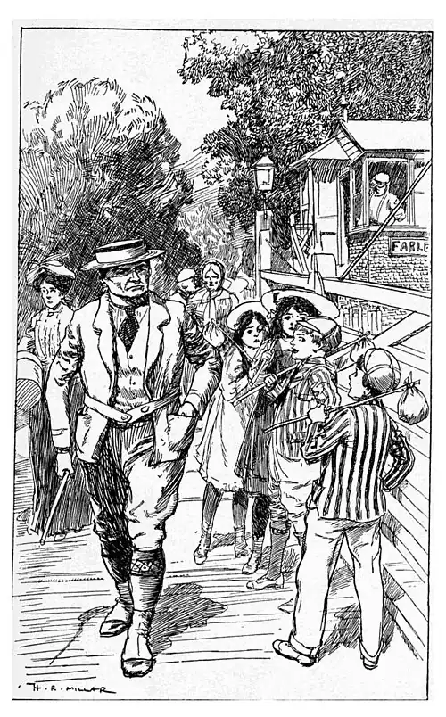 The train stopped, in a snorting, panting hurry, at the little station just beside the gates, let out a few passengers, shook itself impatiently, screamed, and went on. The big gates across the road swung slowly back till they stretched across the railway, and the people who had got out of the train came down the sloping end of the platform and through the small swing-gates, and the four children, who were crossing the line, met the little crowd from the train half-way. There were two women with baskets, a man with a handy-legged dog, and a girl with a large band-box partly hidden by brown paper, and the four children were face to face with him before they knew that there was anyone coming from that train whom they had rather not be face to face with—the Murdstone man himself. He was not a yard from them. Rupert threw up his head and backed a little as if he expected to be hit. The three C.'s breathed a deep concerted 'Oh!' and trembled on the edge of what might be going to happen. No one knew what Mr. Murdstone's power might be. Could he seize on Rupert and take him away? Could he call the police? Anything seemed possible in that terrible instant when they were confronted, suddenly and beyond hope of retreat, with the hated master.