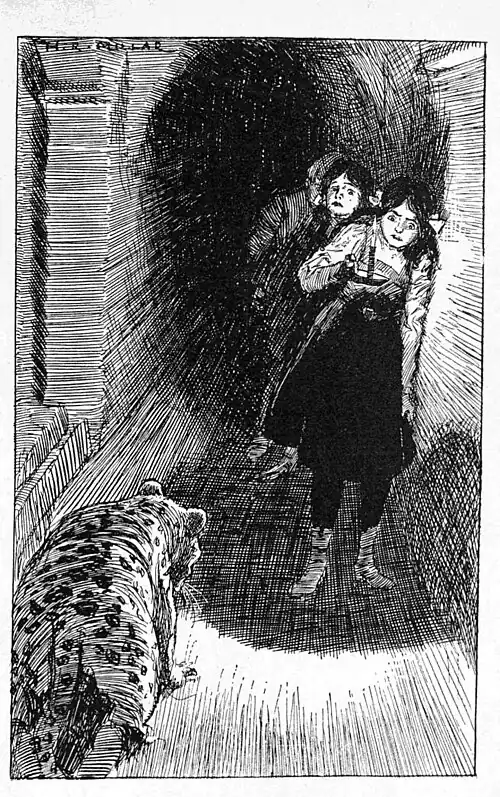 Then Rupert did what was really an heroic thing. He stood up, and, as quickly as he could, began to feel his way back along the side of the passage farthest from the arched recess. He would go to the garden door, and when the children opened it, he could prevent their coming in. To do this he must pass the leopard.