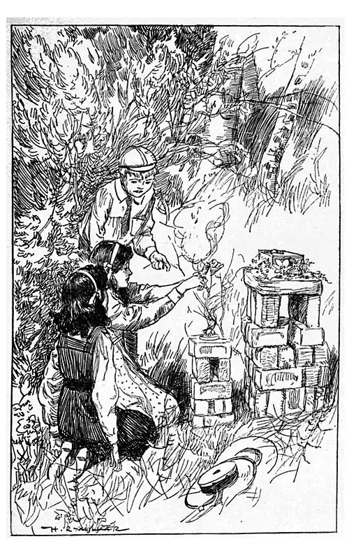 A cardboard box that had held Charlotte's best shoes was filled with sweet pink petals and the waxen image put in it. It looked better standing up, but you don't stand up in a bed, even of rose-leaves. A sort of pedestal was built of old bricks brought, with some toil, from the ruins of the deserted lodge's pig-stye. A flat stone, which took all three to lift, was placed on top. And on this the box. But the box, which said 'Smarm and Simple's Hygienic Footwear' in blue letters outside, troubled the girls because it was ugly, and Charles because it was untruthful.