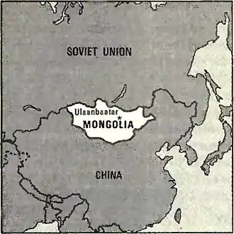 Party and government leaders: Yumjaagiyn Tsedenbal, First Secretary of the MPRP and Chairman of the Presidium of the People's Great Hural; Jambyn Batmonh, Chairman of the Council of Ministers