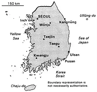 Administrative divisions: 9 provinces (do, singular and plural) and 6 special cities* (jikhalsi, singular and plural); Cheju-do, Chǒlla-bukto, Chǒlla-namdo, Ch’ungch’ǒng-bukto, Ch’ungch’ǒng-namdo, Inch’ǒn-jikhalsi*, Kangwǒn-do, Kwangju-jikhalsi*, Kyǒnggi-do, Kyǒngsang-bukto, Kyǒngsang-namdo, Pusan-jikhalsi*, Sǒul-t’ǔkpyǒlsi*, Taegu-jikhalsi*, Taejǒn-jikhalsi*