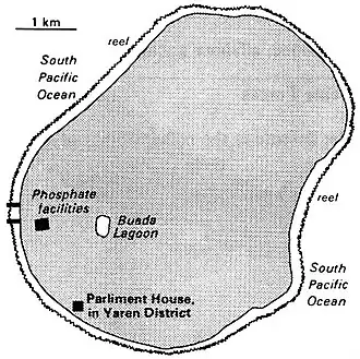Note: one of three great phosphate rock islands in the Pacific (others are Banaba or Ocean Island in Kiribati and Makatea in French Polynesia)