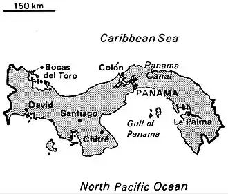 Note: strategic location on eastern end of isthmus forming land bridge connecting North and South America; controls Panama Canal that links North Atlantic Ocean via Caribbean Sea with North Pacific Ocean