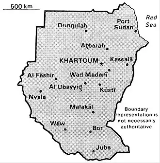 Land boundaries: 7,697 km total; Central African Republic 1,165 km, Chad 1,360 km, Egypt 1,273 km, Ethiopia 2,221 km, Kenya 232 km, Libya 383 km, Uganda 435 km, Zaire 628 km