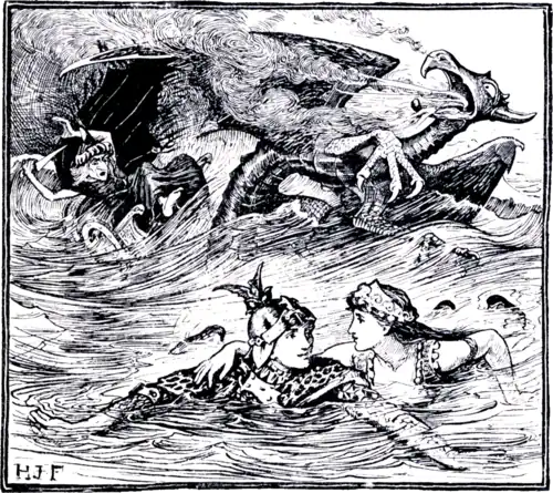 Quick as lightning, and forgetful of every danger, she flew down upon them. But the waters seized her chariot and sunk it in the lowest depths, and the waves bore the wicked old woman down the stream till she was caught in some thorn bushes, where she made a good meal for all the little fishes that were swimming about.