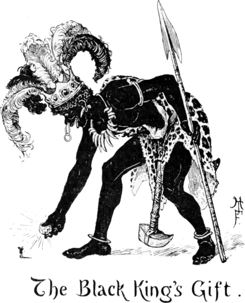 The next morning the storks flew towards the south, for winter was approaching. The Hazel-nut child flew through the air on the stork’s back, and when he wanted to rest he bound his silk cord on to the joint of the bird’s other wing, so that it could not fly any farther. In this way he reached the country of the black people, where the storks took up their abode close to the capital. When the people saw the Hazel-nut child they were much astonished, and took him with the stork to the King of the country. The King was delighted with the little creature and kept him always beside him, and he soon grew so fond of the little man that he gave him a diamond four times as big as himself. The Hazel-nut child fastened the diamond firmly under the stork’s neck with a ribbon, and when he saw that the other storks were getting ready for their northern flight, he untied the silk cord from his stork’s wings, and away they went, getting nearer home every minute. At length the Hazel-nut