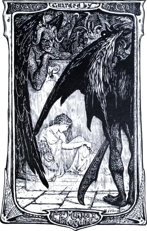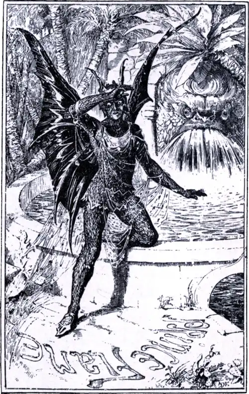 These words were read by one of the genii, who repeated them to his master. The Prince of the Air, in his turn making himself invisible, was led to the fountain, and waited for Rosalie. When she drew near he held out his hand, which she grasped eagerly, taking it for that of her lover; and, seizing his opportunity, the Prince passed a cord round her arms, and throwing off his invisibility cried to his spirits to drag her into the lowest pit.