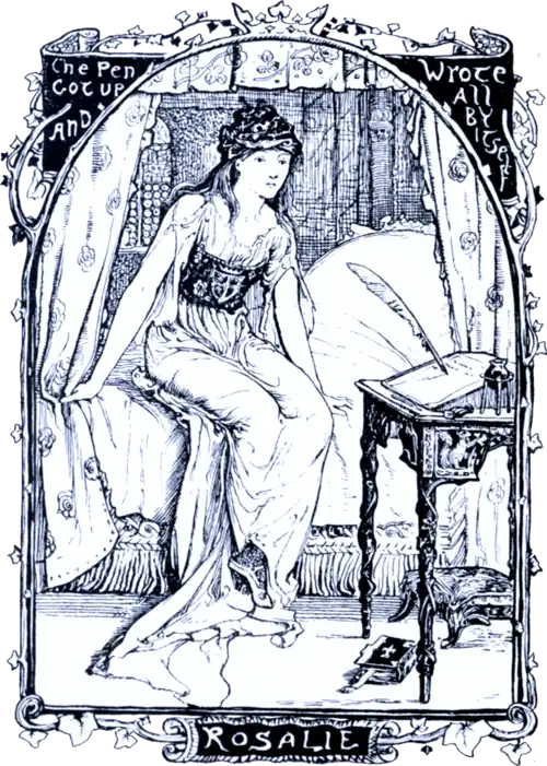 One day Rosalie was sitting alone in her room thinking of her troubles when she suddenly saw a pen get up from off the desk and begin to write all by itself on a sheet of white paper. As she did not know that it was guided by an invisible hand she was very much astonished, and the moment that the pen had ceased to move she instantly went over to the table, where she found some lovely verses, telling her that another shared her distresses, whatever they might be, and loved her with all his heart; and that he would never rest until he had delivered her from the hands of the man she hated. Thus encouraged, she told him all her story, and of the arrival of a young stranger in her father’s palace, whose looks had so charmed her that since that day she had thought of no one else. At these words the Prince could contain himself no longer. He took the pebble from his mouth, and flung himself at Rosalie’s feet.