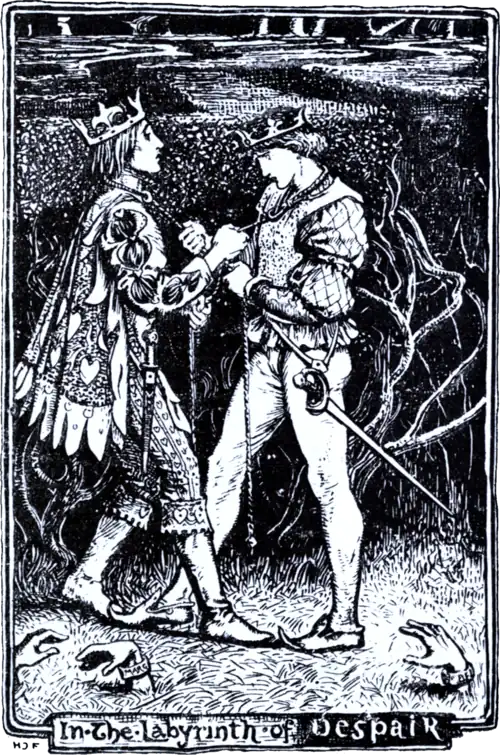 ‘You swear,’ said the Prince, ‘that you will love me till you die, but I fear your faithless heart, and I feel that I shall soon have to seek the Fairy Despair, ruler of half this island. She carries off the lovers who have been cast away by their mistresses, and wish to have done with life. She places them in a labyrinth where they are condemned to walk for ever, with a bracelet on their arms and a cord round their necks, unless they meet another as miserable as themselves. Then the cord is pulled and they lie where they fall, till they are buried by the first passer-by. Terrible as this death would be,’ added the Prince, ‘it would be sweeter than life if I had lost your love.’