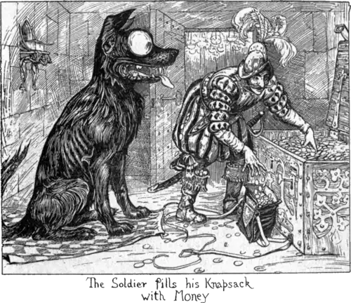‘What’s the meaning of this?’ exclaimed the Soldier. ‘This is a pretty kind of tinder-box, if I can get whatever I want like this. Get me money!’ he cried to the dog, and hey, presto! he was off and back again, holding a great purse full of money in his mouth.