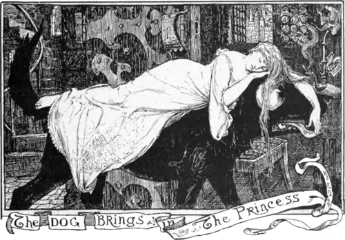 In the night the dog came again, took the Princess on his back and ran away with her to the Soldier, who was very much in love with her, and would have liked to have been a Prince, so that he might have had her for his wife.