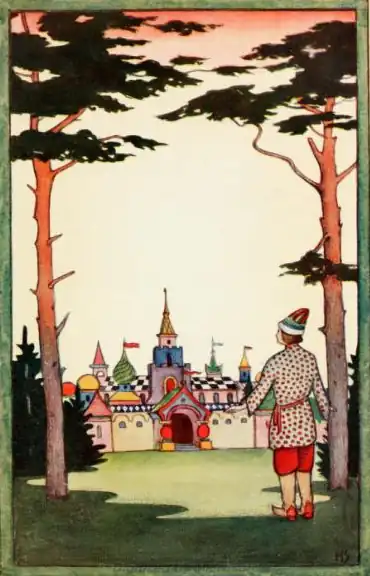The boy wondered and went on further. He came to a large garden and in the garden was a high house with a golden roof. At the gate stood his godfather, smiling. He greeted his godson, made him come inside the gate and took him round the garden. He had never even dreamt of such beauty and joy as there was in that garden.