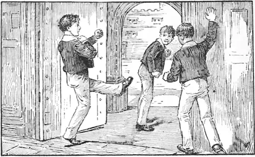 "Hullo, though, that's past a joke," broke out East, springing at the young gentleman who addressed them, and catching him by the collar. "Here, Tommy, catch hold of him t'other side before he can holla."