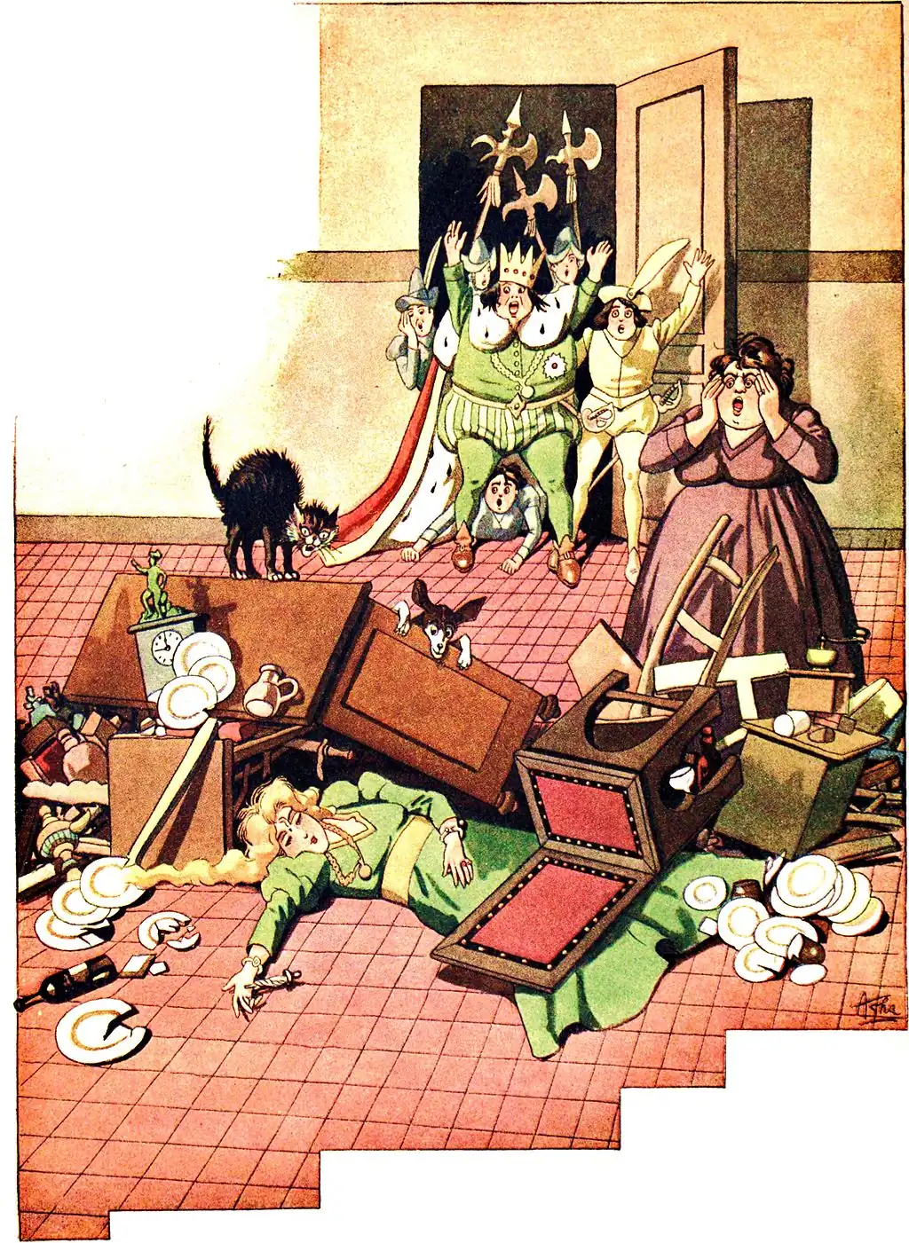 into the hall one very old Fairy, who did not receive an invitation because she was presumed dead. The kings showed her to a prominent place, but they could not provide her with gold utensils like the other Fairies, so the old lady, feeling annoyed, begin murmuring through her teeth.