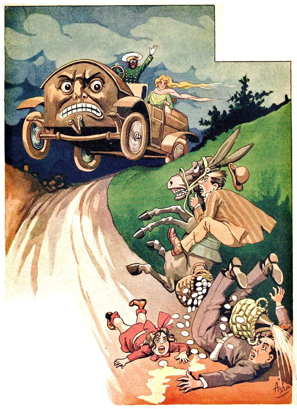 To her cries, the king and the queen and all the palace servants soon arrived, and immediately requested the presence of the Fairy that protected the princess, who at that time was at a distance of two thousand leagues. A dwarf, wearing boots that advanced twenty leagues with every step, set off immediately in search of the Fairy; the fairy, riding in a strange car driven by a black young man, showed up
