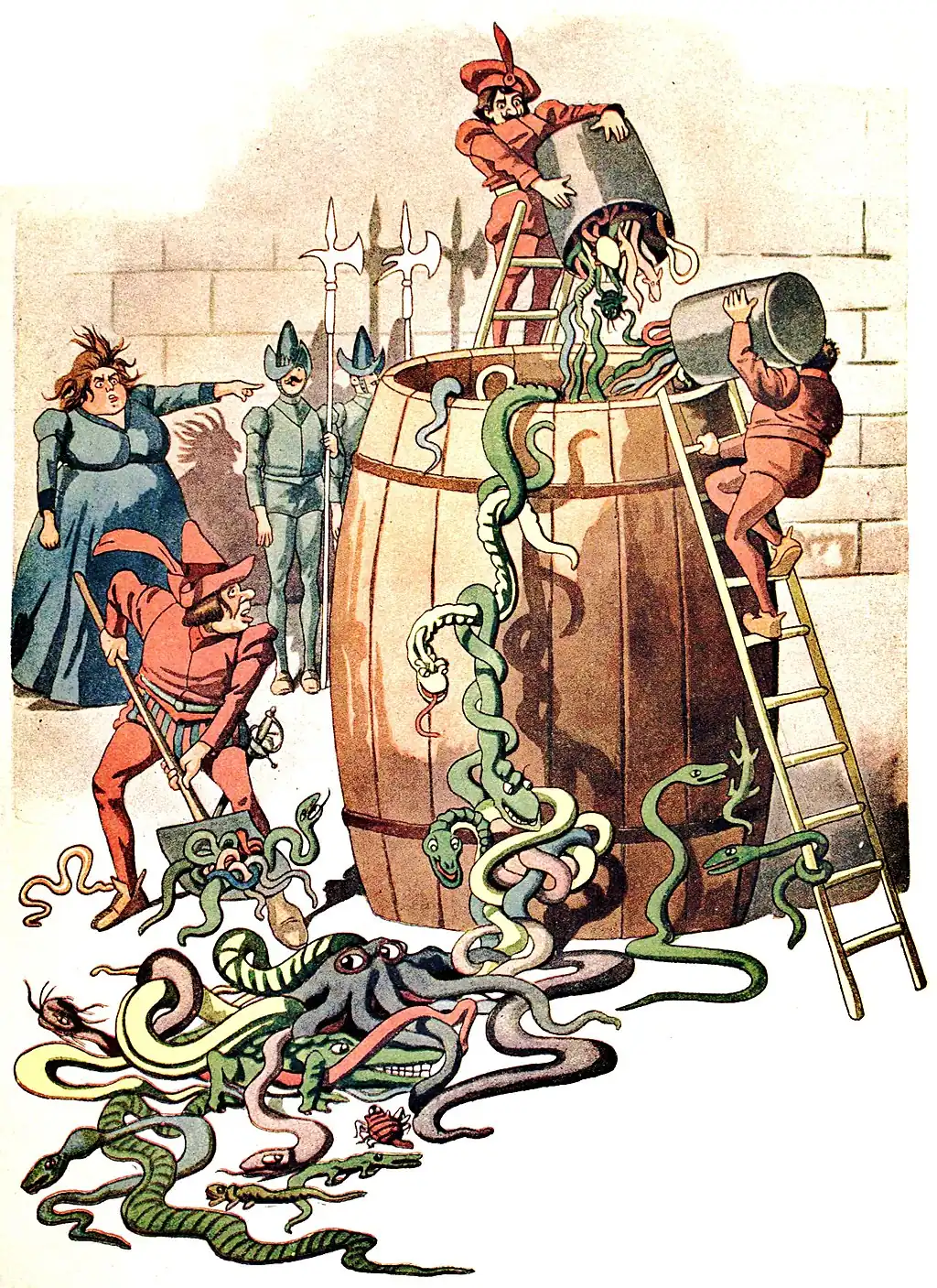 The ogre, upset, ordered a large tank to be filled with frogs, snakes and all kinds of animals, with the purpose of throwing in it both children and their mother, to enjoy seeing them die and eat them later… however, at the moment when this monstrous crime was to occur, the king, the children's father, appeared, and immediately ordered that this vile execution be stopped.