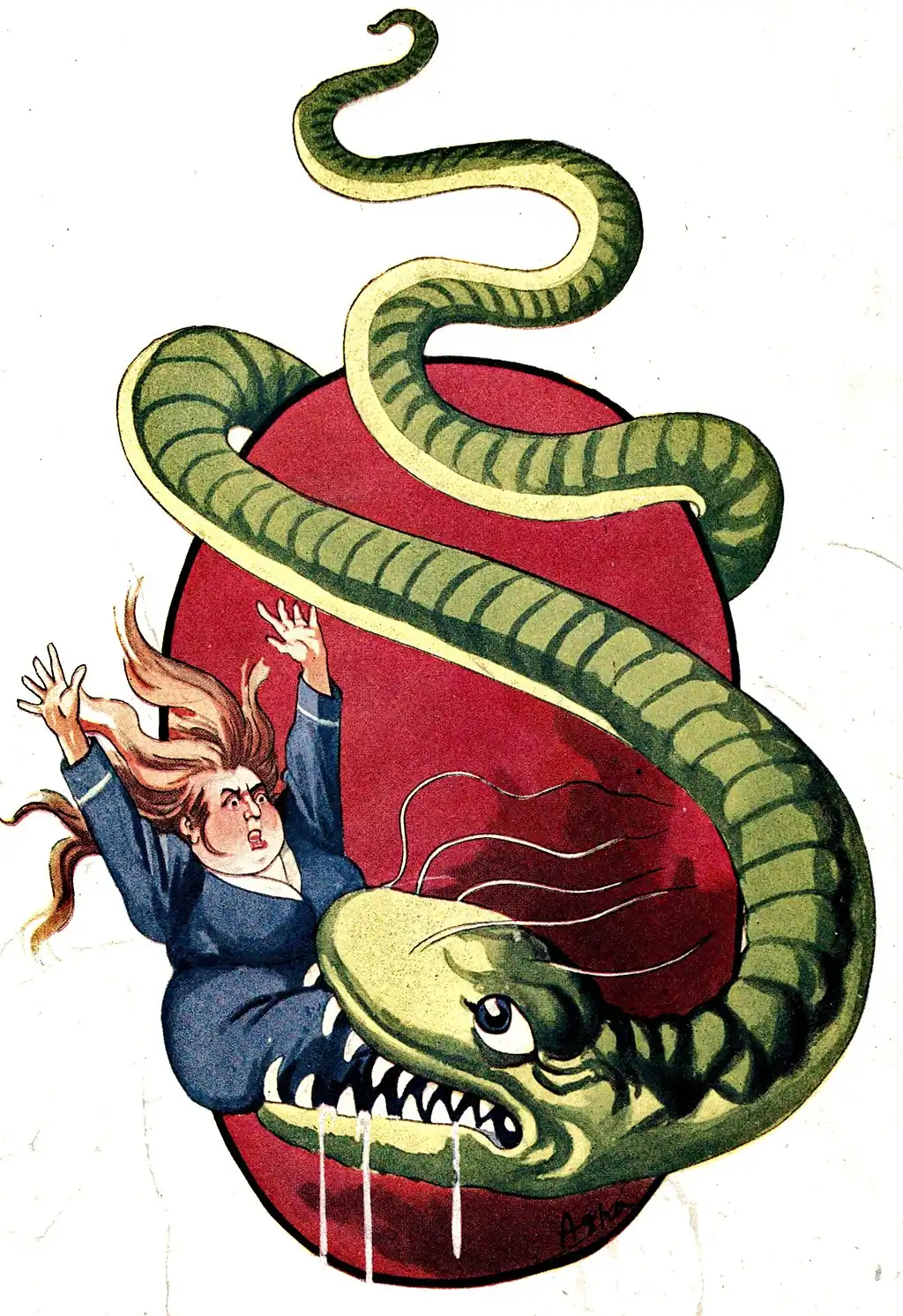 The ogre, upon seeing her diabolic plans frustrated, threw herself in the tank, and the frogs and snakes there ate her in a moment. Such is the fate of bad people that enjoy making good people suffer!