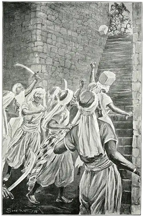 Crash, crash, crash! Down hurtled the huge stones, flinging the unprepared Moriscos from the steep stairs, where they fell in a confused mass, one upon the top of the other, pinned down by the great boulders which came rolling down upon them from above, cursing, raging, crushed and maimed, utterly taken aback by such a reception; and now only eager and anxious to get out of a place that seemed to rain nether mill-stones upon them.
