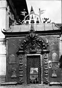 Bhatgaon and Patan are a mass of temples. But the most striking object to me was the great brass gateway of the old palace in Bhatgaon, of which the illustrations opposite will give some idea. The doorway is of bronze, and the exterior ornamentation of beaten and cast brass. Opposite the gateway, on a pedestal, is a figure, with a brass umbrella held over it, of one of the old Newar kings of Bhatgaon.