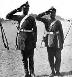 It is a curious army, probably the most remarkable of its kind in the world. It is continually being drilled in archaic manoeuvres, which, with the exception of the battalion marching movements, it always executes rather badly. But when the battalions are on the move, marching either in masses or as on the line of route, they perform very well. The men are physically excellent, though badly set up and equipped archaically, and armed with what apparently is the old Brown Bess — very old indeed, and apparently never cleaned; yet the regiments have many of them historic names, have an excellent pride in themselves, and an excellent esprit de corps; in fact, the army is an army, in my opinion, and only requires a modern standard of training and arms to be a most formidable force. It is in all senses a regular army, by which I mean an army with national ideals and a sense of responsibility.