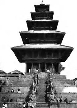 I spent several days in being taken round the three great cities, Khatmandu, Patan, and Bhatgaon, in which are situated most of the old temples and palaces of the Newar kings. Few Nepalese recognise the name Khatmandu as the capital of Nepal: Khatmandu or Khāt Manru (the wooden temple) was one of the oldest Newar temples and gave its name to the town that grew up round it. The capital of the country is simply known as Nepal and nothing else, as I have before stated. What may be called the ecclesiastical architecture shows distinct Chinese influence; in fact, I only 3a w two temples purely Hindu in the character of their architecture, namely, the temple of Narayan and that of Bhimsen in Patan.