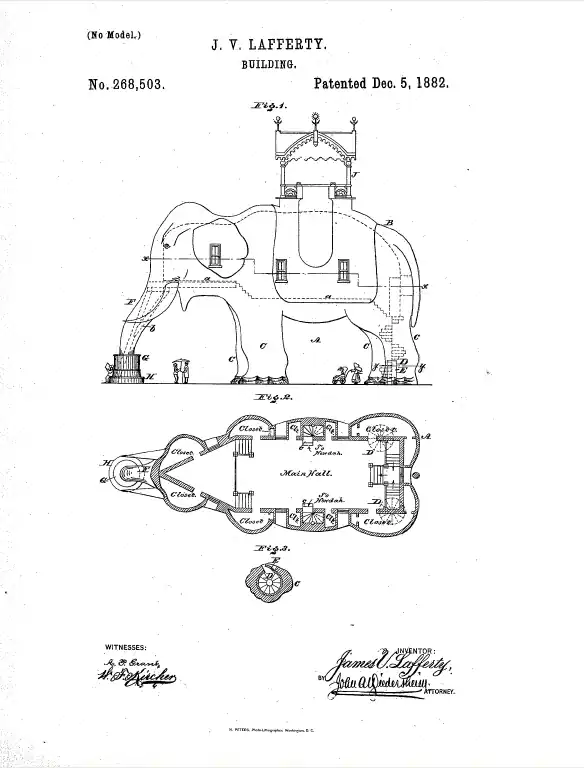 Referring to the drawings, A represents a building which is in the form of an animal—in the present case that of an elephant—the body B and the legs C of which are hollow, the body being essentially supported on said legs, and, if desired, by means of suitable tresses within the same, and otherwise strengthened. The body is properly floored, as shown by the dotted lines a, Fog. 1, furnished with windows, doors &c., and divided into apartments or rooms, closets, &c., and in the legs C and stairs D, which lead to the floor a, so that access is had to the body B from the ground, the legs having doors E for evident purposes, each leg, if desired, containing a flight of stairs, although for ordinary purposes the hind legs only are provided with stairs.