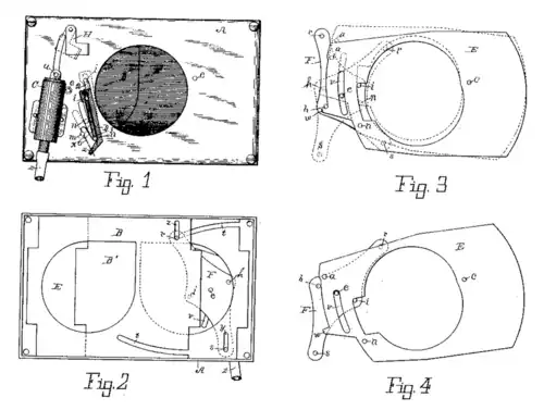 Returning to Fig. 1, While it is designed that the dog D (after being tripped by the engagement of its inclined end x with the projection n) shall fall by its own weight to a proper position to again form an engagement of its shoulder 3 with the projection n of the lever-plate E, ready for the next operation, if desirable, a spring o may be employed to bring said dog back to place after being tripped, as shown in Fig. l, or otherwise; but said spring is not deemed necessary by us.
