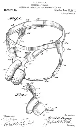 It will be noted that with my improved construction, not only are the penis and testicles entirely inclosed within the metal pockets formed for their, reception, but the spermatic cord is likewise covered and the patient is absolutely prevented access to this cord, which as is well known, if he could, he might defeat the very purpose for which the device is intended.