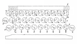 5. A three-bank keyboard having the characters A, U, E, O, YA, YU, YO, WA, and their undersized duplicates in shifts in the third bank, the characters TA, TE, I, SU, KA, N, NA, NI, RA in lower case in the third bank, the characters CHI, TO, SHI, HA, KI, KU, MA, NO, RI in lower case in the second bank, and the characters TSU, SA, WO, HI, KO, MI MO NE, RE in lower case in the first bank, having upper-case or second-case characters SE, SO, HE, KE, MU, ME, RO in the first bank, also having a dakuon mark on a partially silent key at the right-hand end of the third bank, and also having a prolongation mark and other signs in third case in the first bank, and also having RU and undersized TSU in third case in the first bank, and undersized I and signs in third case in the second bank, and nine Roman numerals in second case in the second bank, and numeral 0 in second case in the first bank.