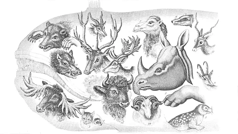 | HEADS, &C. OF QUADRUPEDS, UPON AN OUTLINE OF THE HEAD OF THE GREAT WHALE. | |||