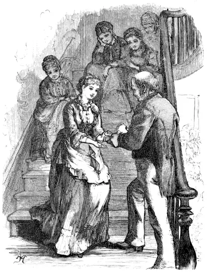 "Here, Miss Rose," he said,—"catch it." But Rose ran half-way downstairs, received the cake, dimpled her thanks, and retreated to the darkness above, whence sounds proceeded which sent the amused Professor into the parlor convulsed with suppressed laughter. Pretty soon Clover stole up the back stairs to report.
