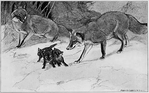 The ninth day of the cubs' life on earth marked an event more important to Mother Fox than the Declaration of Independence, or the promulgation of the Suffrage Amendment. On that date, all three of her cubs opened their eyes! Twelve nights later, when the May moonlight made a new heaven and a new earth, they took their first journey. It was only twenty feet, but it covered the distance from one world to another. For a moment three sharp little noses peered out wonderingly at the new world. It was roofed with a shimmering sky instead of damp earth, and was big and boundless and very, very beautiful. Altogether the newcomers approved of it highly, although there did seem to be a great waste of air, and it was not so warm and cozy as the world underground.